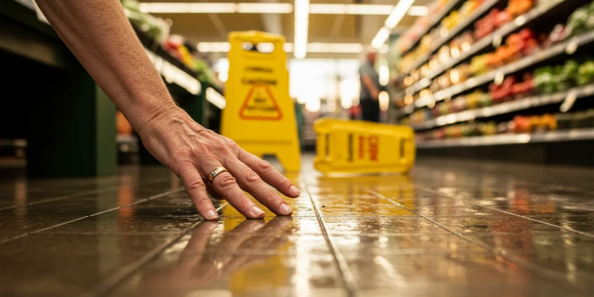 - Wet or slippery floors: Spills in grocery stores, leaks in restaurants, or rain tracked into office buildings are frequent culprits.