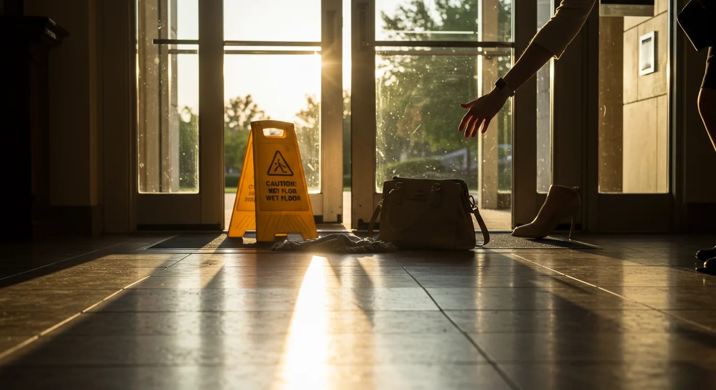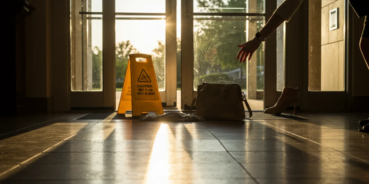 - Wet or slippery floors: Spills, leaks, rain tracked inside, or freshly waxed floors without proper warning signs.